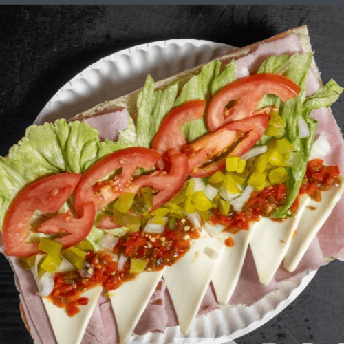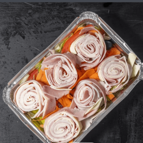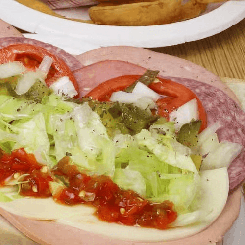 Fresh mix of iceberg lettuce, juicy tomatoes, shredded carrots, crisp cucumbers, black olives, pepperoncini, and red cabbage, creating the perfect balance of crunch and zest. Topped with rolled slices of mortadella, salami, bologna, capicola (hot ham), and provolone cheese, it’s a satisfying blend of bold flavors and fresh ingredients. Served with pita bread and a side of Italian dressing.