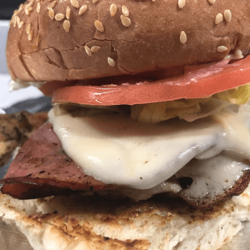 🍔🔥 A true hearty classic! Our juicy grilled burger is stacked high with a fried egg, savory ham, and melted American cheese, all topped with fresh lettuce, tomato, and our signature special sauce. Served on a toasted bulky roll, this burger is a flavor-packed bite that hits all the right notes!