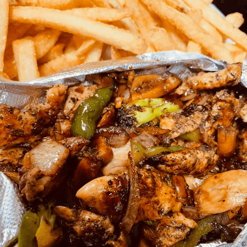 Tender, marinated grilled chicken tossed with fresh broccoli, peppers, onions, and mushrooms, stir-fried to savory perfection. Bursting with flavor and served with a fresh side salad and your choice of classic fries, crispy seasoned fries, homemade onion rings, or fluffy rice—a hearty, delicious meal! 🍽️