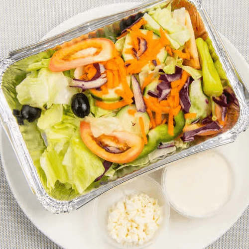 Fresh, crisp, and full of flavor! A refreshing mix of iceberg lettuce, juicy tomatoes, shredded carrots, crisp cucumbers, black olives, pepperoncini, and red cabbage and a side of Feta cheese creating the perfect balance of crunch and zest. Served with pita bread and a side of GREEK dressing, this salad is simple, delicious, and always satisfying! 🥗🔥