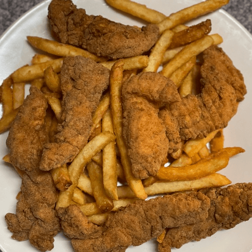 Golden Chicken Finger Dinner Fresh, hand-battered chicken tenders, marinated in garlic, salt, and black pepper, then fried to crispy, golden perfection. Juicy, flavorful, and always satisfying! Served with a fresh side salad and your choice of classic fries, crispy seasoned fries, homemade onion rings, or fluffy rice—a crispy, delicious favorite!