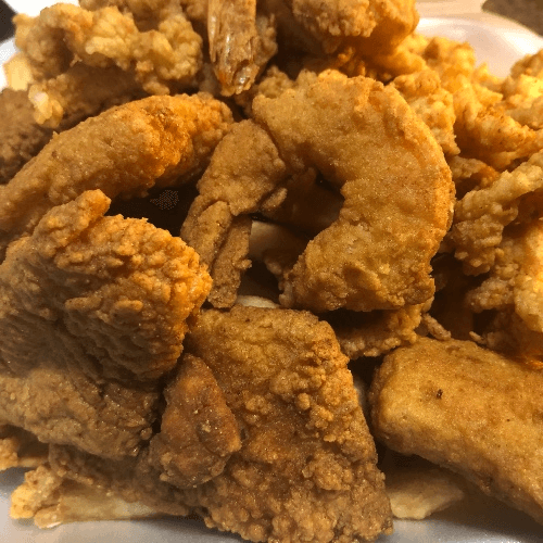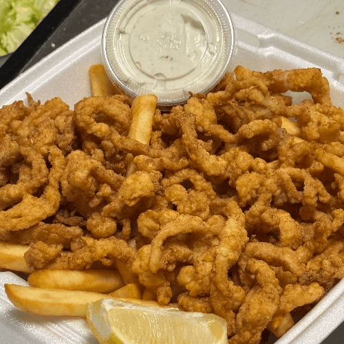 Clam Strip (No Bellies) Breaded-to-order clam strips only (no clam bellies), fried golden and served with your choice of rice, crispy fries, regular fries, or hand-cut onion rings made to order.