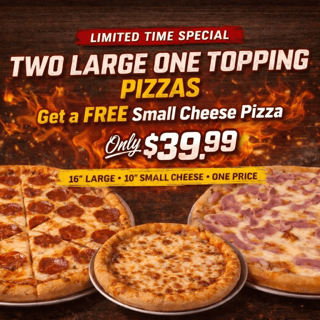 Buy Two Large 1 Topping Pizzas and Get a Small Cheese Pizza free