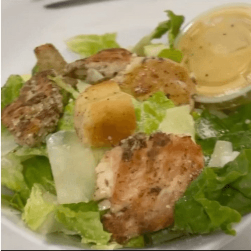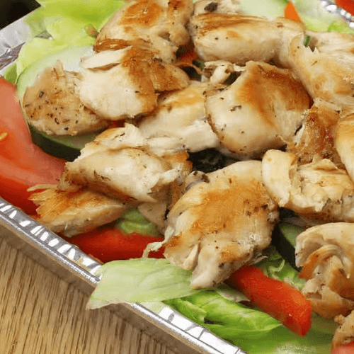 A fresh and satisfying favorite! Tender, marinated grilled chicken tenderloins served over a crisp mix of iceberg lettuce, juicy tomatoes, shredded carrots, crisp cucumbers, black olives, pepperoncini, and red cabbage, creating the perfect balance of crunch and zest. Served with warm pita bread and a side of Italian dressing, this salad is hearty, flavorful, and packed with goodness! 🥗🔥