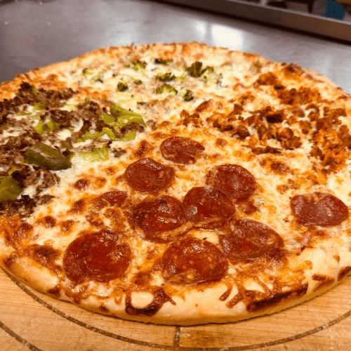 🔥 1 Pizza. 4 Epic Flavors. Can’t decide? Get them all in one! Our Four-Quarter Combo Pizza is packed with flavor — each quarter loaded with a different favorite: 🍗 Buffalo Chicken Ranch – Tangy, spicy, and creamy. 🍕 Classic Pepperoni – A timeless favorite, crispy and bold. 🥩 Steak & Peppers – Juicy steak with sautéed peppers. 🥦 Broccoli & Chicken Alfredo – Creamy, cheesy comfort