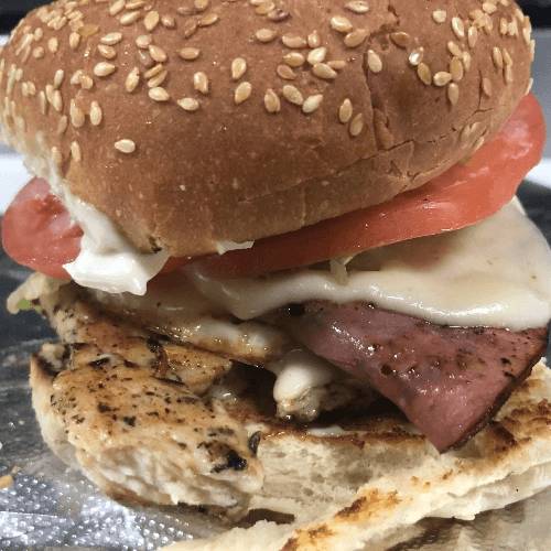 Backwoods Grilled Chicken Sandwich 🍗🔥 A flavorful twist on a classic! Juicy, marinated grilled chicken topped with a fried egg, savory ham, and melted American cheese, finished with fresh lettuce, tomato, and our signature special sauce. Served on a toasted bulky roll, this sandwich is hearty, delicious, and packed with bold flavors!