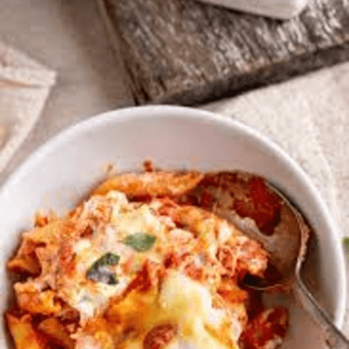 Ziti noodles with your choice of sauce, melted cheese on top and served with garlic bread.